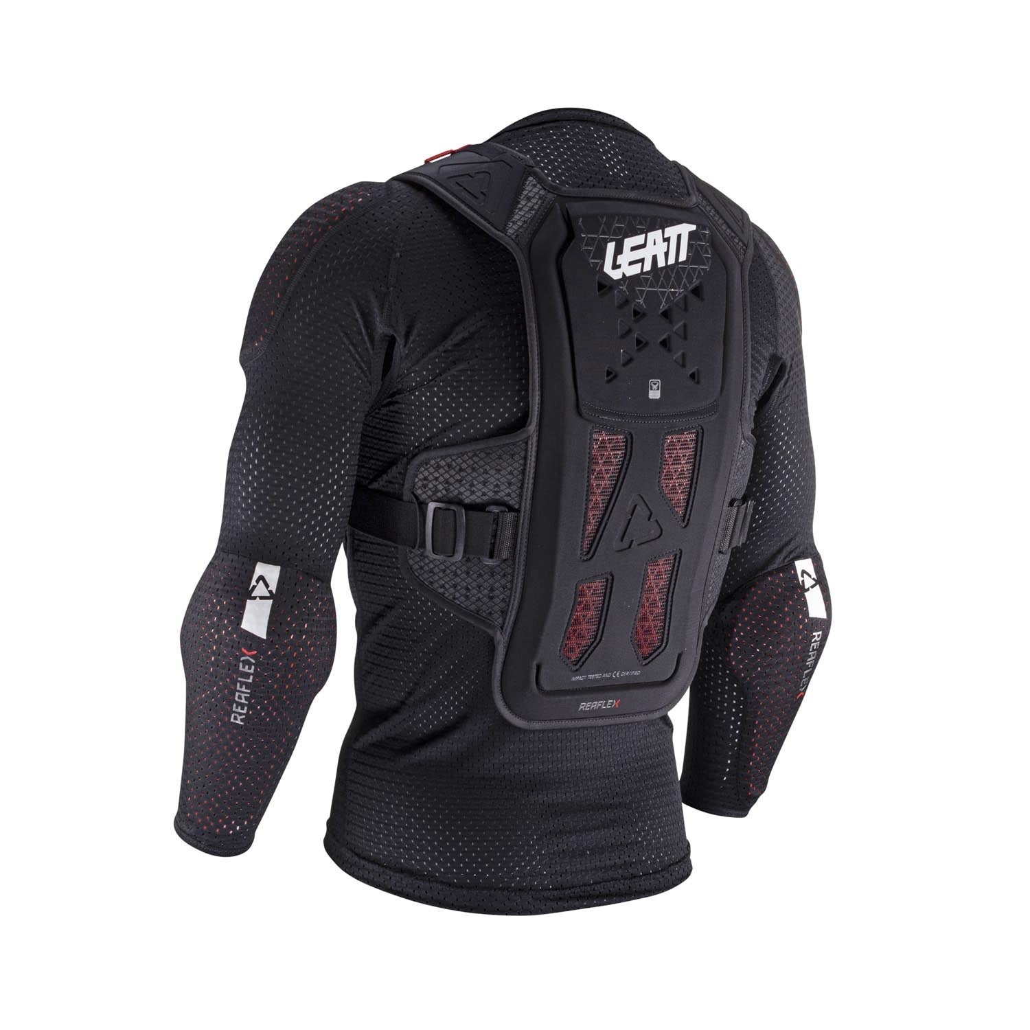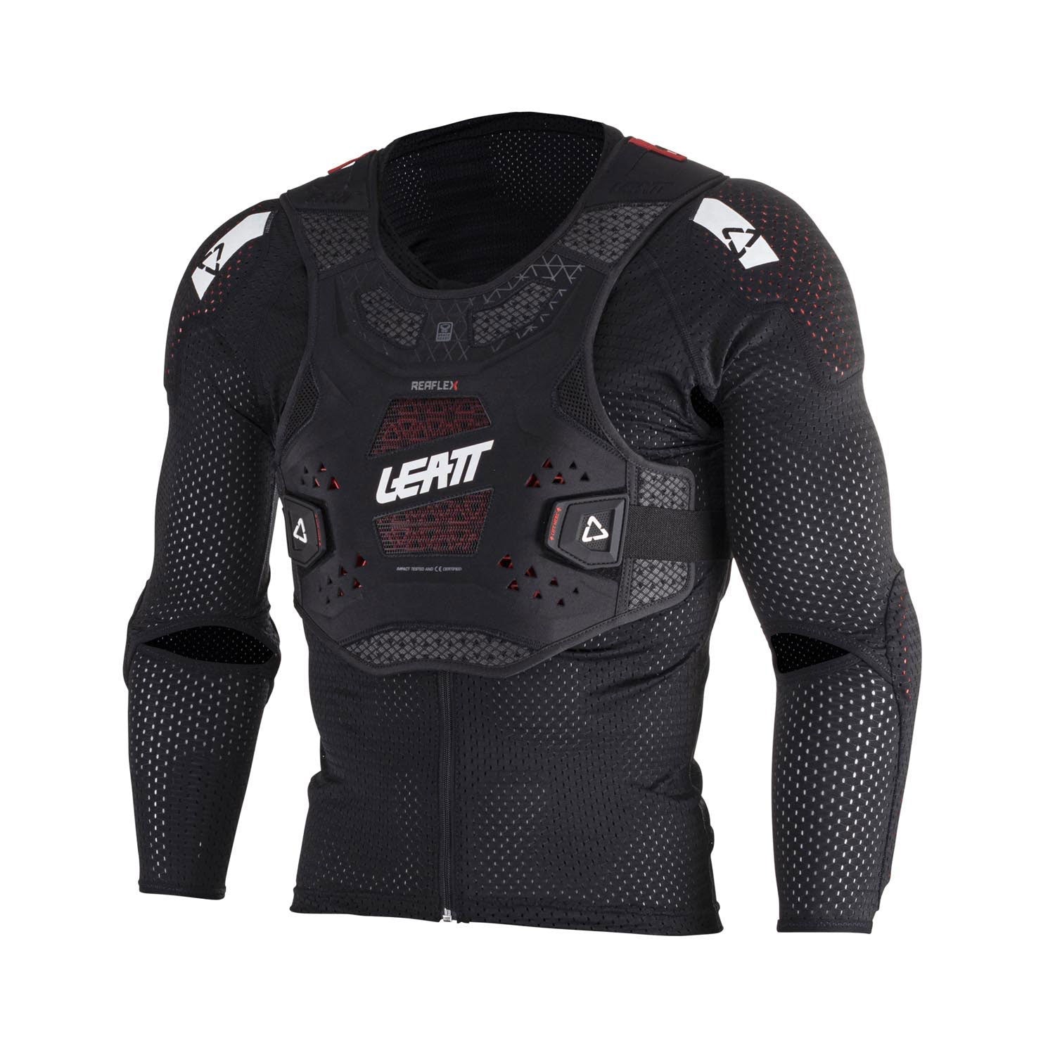A Proteção Integral Leatt ReaFlex é uma solução inovadora apresentada em duas peças, pensada para riders que querem proteção integral com um ajuste confortável e ventilado. A primeira peça é uma camisola de compressão modular com fecho completo, que integra proteções de impacto macias nos ombros e cotovelos. A segunda peça é uma proteção completa para peito e costas, com certificação CE, garantindo segurança na parte superior do corpo.